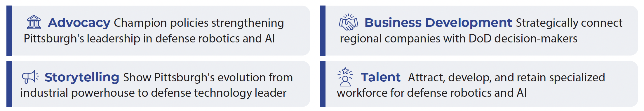 By orchestrating targeted engagements between defense leadership and our innovation ecosystem, we leverage Pittsburgh's unique transformation from industrial powerhouse to AI and robotics hub. This collaborative approach allows DoD leaders to witness firsthand how our region's technological advancements can address critical battlefield challenges while ensuring America's warfighters maintain technological superiority in an evolving security landscape.