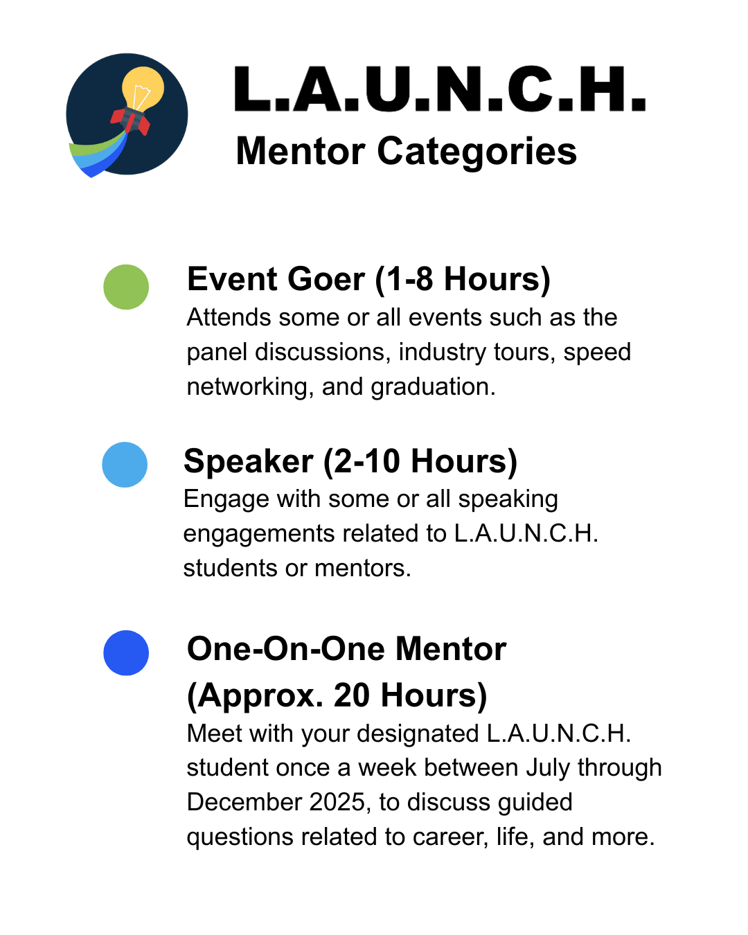Throughout the rest of the year, all L.A.U.N.C.H. alumni will be invited to a series of events including mentor meetups, book club, and volunteer opportunities.
