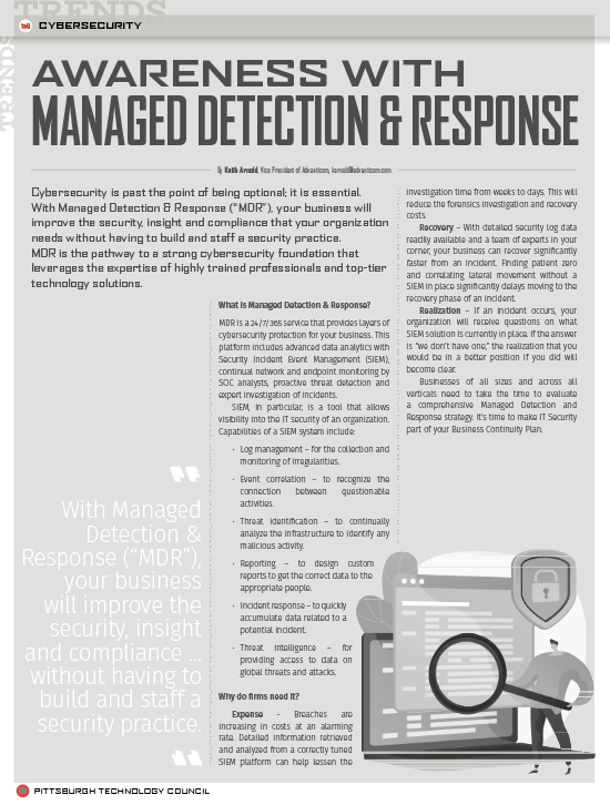 Cybersecurity is past the point of being optional; it is essential. With Managed Detection & Response (“MDR”), your business will improve the security, insight and compliance that your organization needs without having to build and staff a security practice. MDR is the pathway to a strong cybersecurity foundation that leverages the expertise of highly trained professionals and top-tier technology solutions.