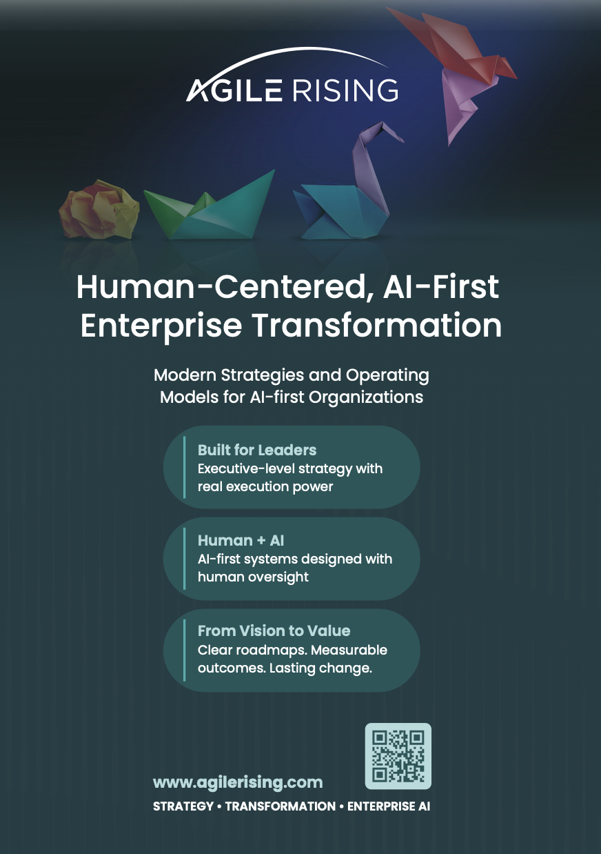 Agile Rising is a leading consulting firm dedicated to helping organizations transform the way they operate to drive adaptability and sustainable growth. At the core of our practice is innovation and a fundamentally human-centered philosophy. We don’t just advise; we collaborate deeply with our clients, co-creating strategies and solutions tailored to their unique challenges. Our team of seasoned experts brings decades of experience and deep domain knowledge to every engagement, ensuring measurable impact and lasting success.