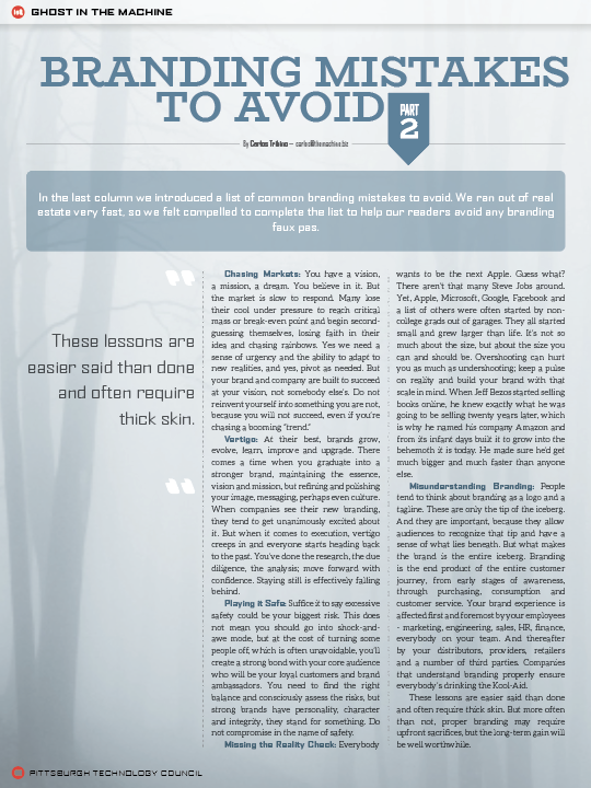 In the last column we introduced a list of common branding mistakes to avoid. We ran out of real estate very fast, so we felt compelled to complete the list to help our readers avoid any branding faux pas.