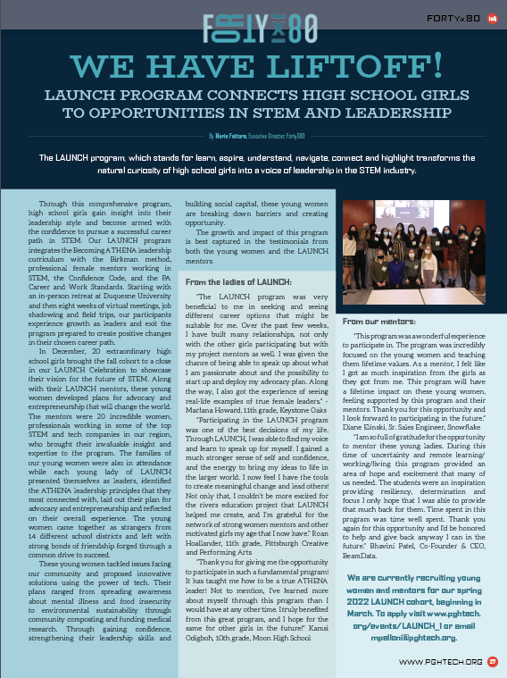 We are currently recruiting young women and mentors for our spring 2022 LAUNCH cohort, beginning in March. To apply visit www.pghtech.org/events/LAUNCH_1 or email mpelloni@pghtech.org.