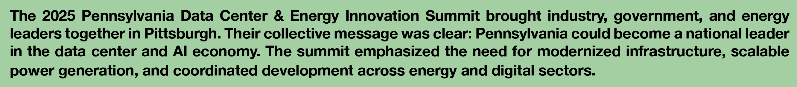 In the year since the 2025 Data Center & Energy Innovation Summit, Western Pennsylvania has demonstrated impressive momentum. Large-scale private investments in energy generation, grid modernization, and manufacturing represent meaningful steps toward the summit’s vision of a power-rich, AI-ready region.