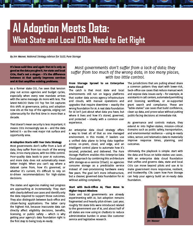 Ultimately, the playbook is simple: start with the data and focus on table-stakes use cases. With an enterprise data cloud foundation that unifies and governs data, state and local CIOs can move beyond pilots and use AI to make government more responsive, resilient, and trustworthy. CTA: Learn how Pure Storage can help your agency build an AI-ready data foundation.
