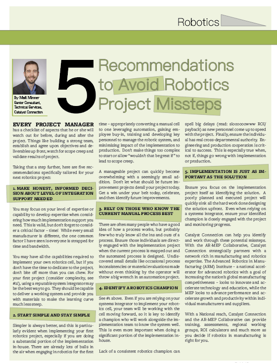 With a National reach, Catalyst Connection and the AR-MEP Collaborative can provide training, assessments, regional working groups, ROI calculators and much more as you decide if robotics in manufacturing is right for you.