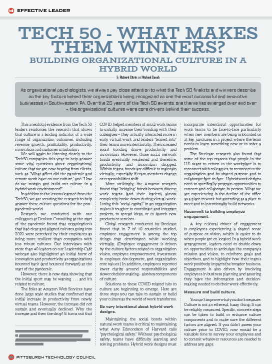 This anecdotal evidence from the Tech 50 leaders reinforces the research that shows that culture is a leading indicator of a wide range of organization outcomes, including revenue growth, profitability, productivity, innovation and customer satisfaction.