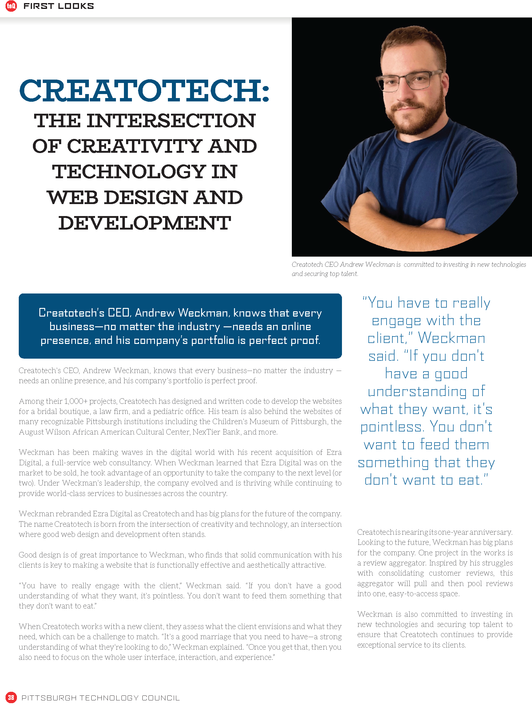 Among their 1,000+ projects, Creatotech has designed and written code to develop the websites for a bridal boutique, a law firm, and a pediatric office. His team is also behind the websites of many recognizable Pittsburgh institutions including the Children’s Museum of Pittsburgh, the August Wilson African American Cultural Center, NexTier Bank, and more.