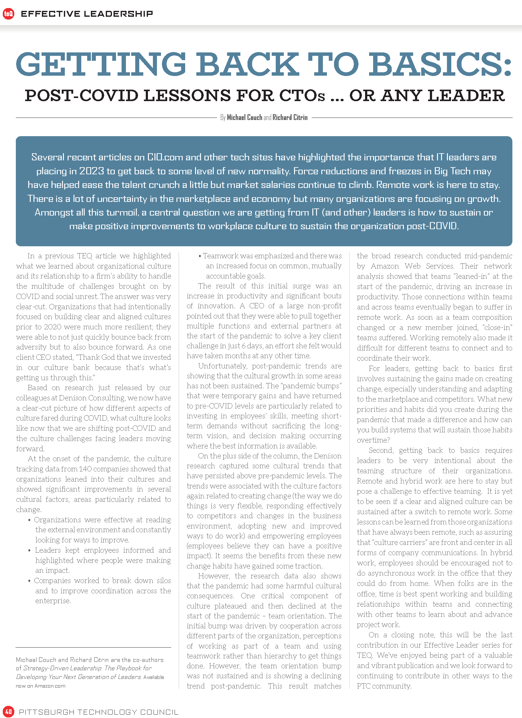 On a closing note, this will be the last contribution in our Effective Leader series for TEQ. We’ve enjoyed being part of a valuable and vibrant publication and we look forward to continuing to contribute in other ways to the PTC community.