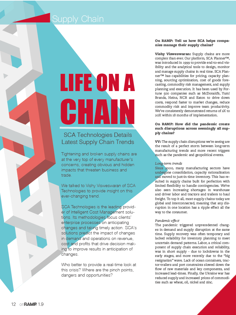 Vishy Visweswaran: Supply chains are more complex than ever. Our platform, SCA Planner™, was introduced in 1999 to provide end-to-end visibility and the analytical tools to design, monitor and manage supply chains in real time. SCA Planner™ has capabilities for pricing, capacity planning, sourcing optimization, cost of goods forecasting, commodity risk management, and supply planning and execution. It has been used by Fortune 500 companies such as McDonald’s, Yum! Brands, Heinz, NCR and Eaton to drive down costs, respond faster to market changes, reduce commodity risk and improve team productivity. We’ve consistently demonstrated returns of 2X to 20X within 18 months of implementation.